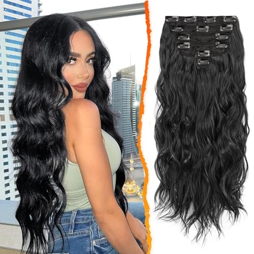 BARSDAR Beach Wavy Black Clip in Hair Extensions – 20 Inch 6PCS Thick Soft Synthetic Hairpieces, Full Head Clip in Hair Extensions for Women – Long Voluminous Easy Wear Daily Party – Natural Black