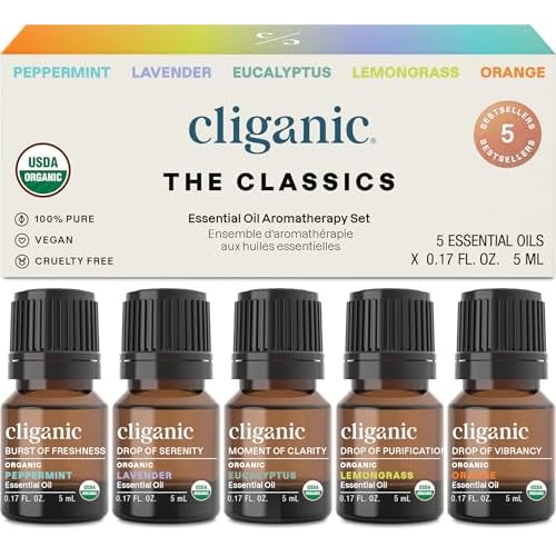 Cliganic Organic Essential Oils Set (Top 5 – The Classics) – 100% Pure Natural – Aromatherapy, Candle Making – Peppermint, Lavender, Eucalyptus, Lemongrass & Orange (Packaging May Vary)