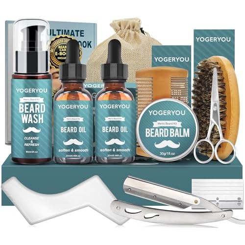 Beard Kit,Beard Grooming Kit for Men W/Straight Razor,2 PACK Beard Oil, Wash, Balm, Brush, Comb, Scissors Mens Birthday Christmas Gifts for Men Boyfriend Husband Beard Trimming Shaving Kit