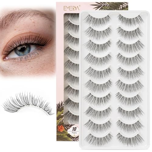 EMEDA False Eyelashes Natural Lashes Wispy 0.01mm Ultra Thin Band 12mm Pestañas Postizas Naturales Cat Eye 10 Pairs Invisible Clear Band 3D Demi Wispies Short Fake Eye Lashes Strips Handmade (005)