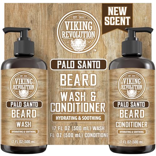 Viking Revolution Palo Santo Beard Wash and Beard Conditioner Set with Argan and Jojoba Oils – Softens and Strengthens – Natural Palo Santo Scent – Beard Shampoo with Ginseng Root Extract (17 oz)