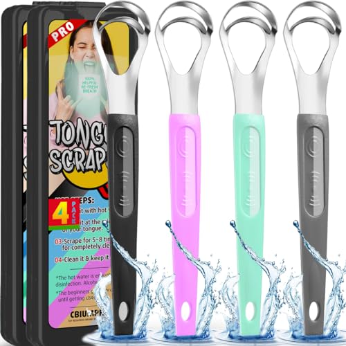 Cbiumpro 4-Pack Tongue Scraper for Adults & Kids, Stainless Steel Tongue Cleaner with Travel Case, Reduce Bad Breath