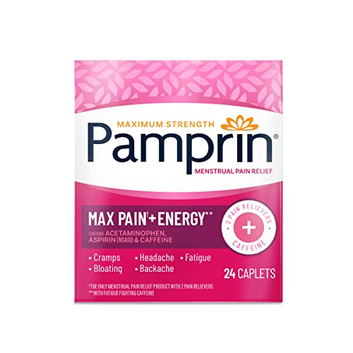 Pamprin Maximum Strength Max Pain and Energy Formula, Menstrual Period Symptoms Relief for Cramps, Bloating and Fatigue, 24 Caplets