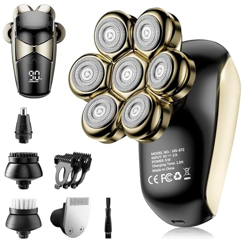 Detachable Head Shavers, SHPAVVER 5 in 1 Electric Razor IPX7 Waterproof for Bald Men, Wet Dry LED Display Rechargeable 7D Rotary Shaver Grooming Kit with Type C Charge A