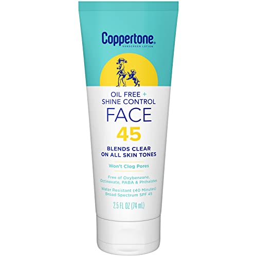 Coppertone Oil Free + Shine Control Sunscreen Face Lotion SPF 45, Lightweight Sunscreen for All Skin Tones, Won’t Clog Pores, Fragrance Free, 2.5 Fl Oz Tube