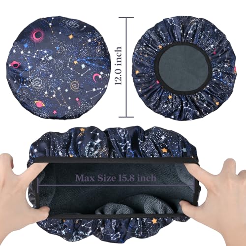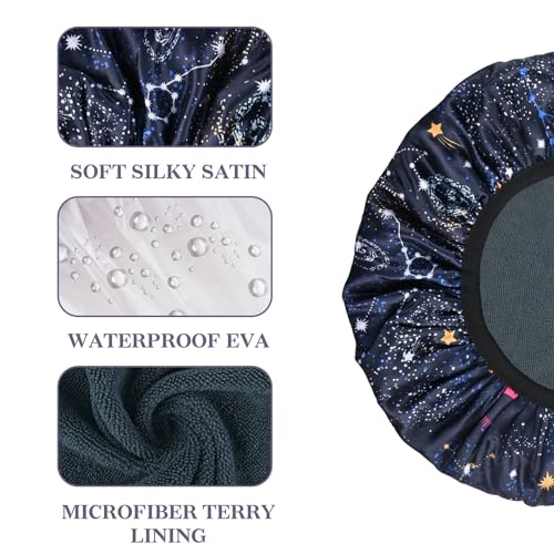 Navy Astral Print Satin Shower Cap, Three-Layer Terry Cloth Lined, with Silk Hair Ties, Microfiber Waterproof Reusable Large Size Shower Cap for Women Long Thick Hair