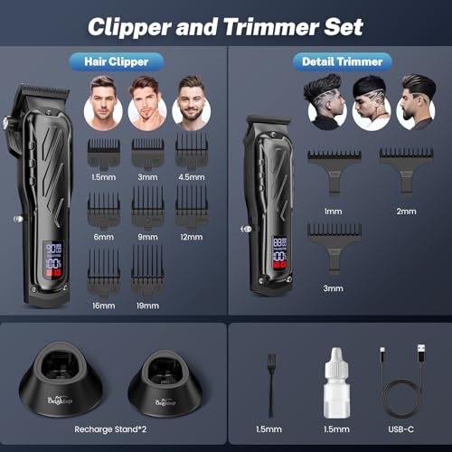 Brightup Barber Hair Clippers [Brushless 9000RPM & Cordless] for Men, Professional Clippers & Trimmers Set with USB-C Charging Stand, Hair Tools Cutting Kit with LCD Display, Gift for Men