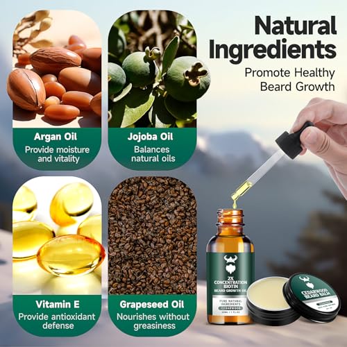 Beard Growth Kit – 2X Concentration Biotin for Men, Natural Argan, Jojoba Oils and Vitamins (Cedarwood)