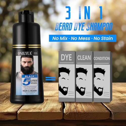 Mens Beard Dye Shampoo for Men, 5 Minute 100% Grey Reducing, Mustache & Beard Color for Men Black Hair Dye Shampoo 3 In 1, Long Lasting & Easy Use & Dermatologist Tested & Dye Beard At Home, 200ML