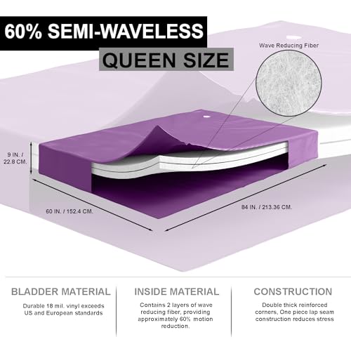 SEMI-WAVELESS 60%, Queen Size, Waterbed Hardside Mattress Bundle, Includes Fill & Drain Kit, 8oz. Water Conditioner and Stand-Up Liner, Heavy Duty Vinyl, 60″W x 84″L x 9″H, Frame NOT Included