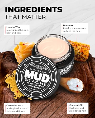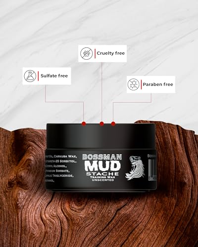 Bossman MUDstache Unscented Mustache Wax for Men (1 oz) – Strong 24-Hour Hold, Non-Tacky & Easy to Apply for Taming & Styling