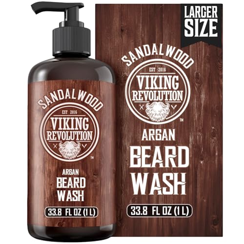 Viking Revolution Sandalwood Beard Wash for Men with Argan Oil – Beard Softener and Strengthener Beard Shampoo with Ginseng, Red Sage, Vitamin B5, Vitamin E – Sandalwood Beard Care (33.8 Fl oz)