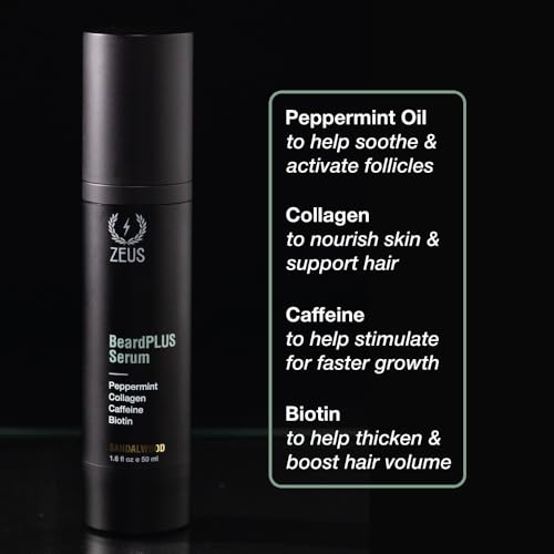 ZEUS BeardPlus Growth Serum for Men, Refined Beard Oil with Biotin, Caffeine & Collagen for Thicker, Fuller, Softer Facial Hair & Healthy Skin Care (Made in USA) 1.6 oz