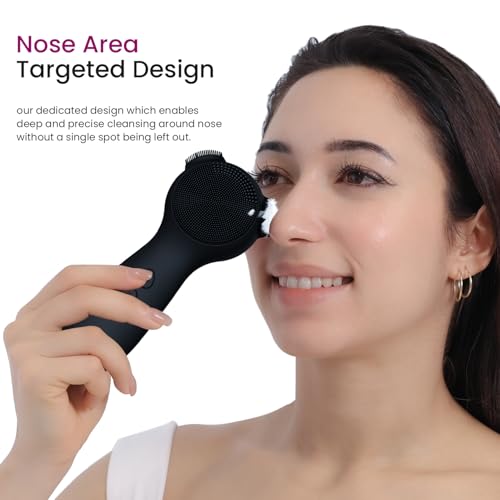 【Nose Area Targeted Design】Compared to other facial brush on the market, our silicone face scrubber has Two nose brush heads on the top, which can easily clean special areas such as the sides of the nose and T-zone. One head has the thicker bristles and the other has the finer bristles, Suitable for different skin areas. This design enables deep and precise cleansing around nose and eyelids, without a single spot being left out.