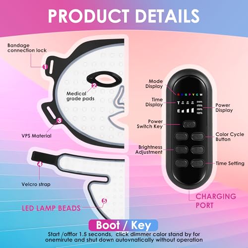 MULTIPLE COLORS TO CHOOSE FROM: Our face and neck mask has seven colors of LED lights that can meet the needs of different skin