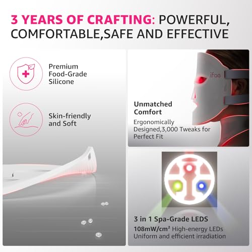 High-Energy LED with 7 Color + NIR Modes: Featuring 288+108 high-energy LED beads (108mW/cm²) and 7 color light wavelengths with Near-Infrared (NIR), this red light mask effectively targets acne, pigmentation, and signs of aging. Its food-grade silicone ensures a comfortable fit, while built-in eye protection guarantees safe, even light coverage for rejuvenated skin